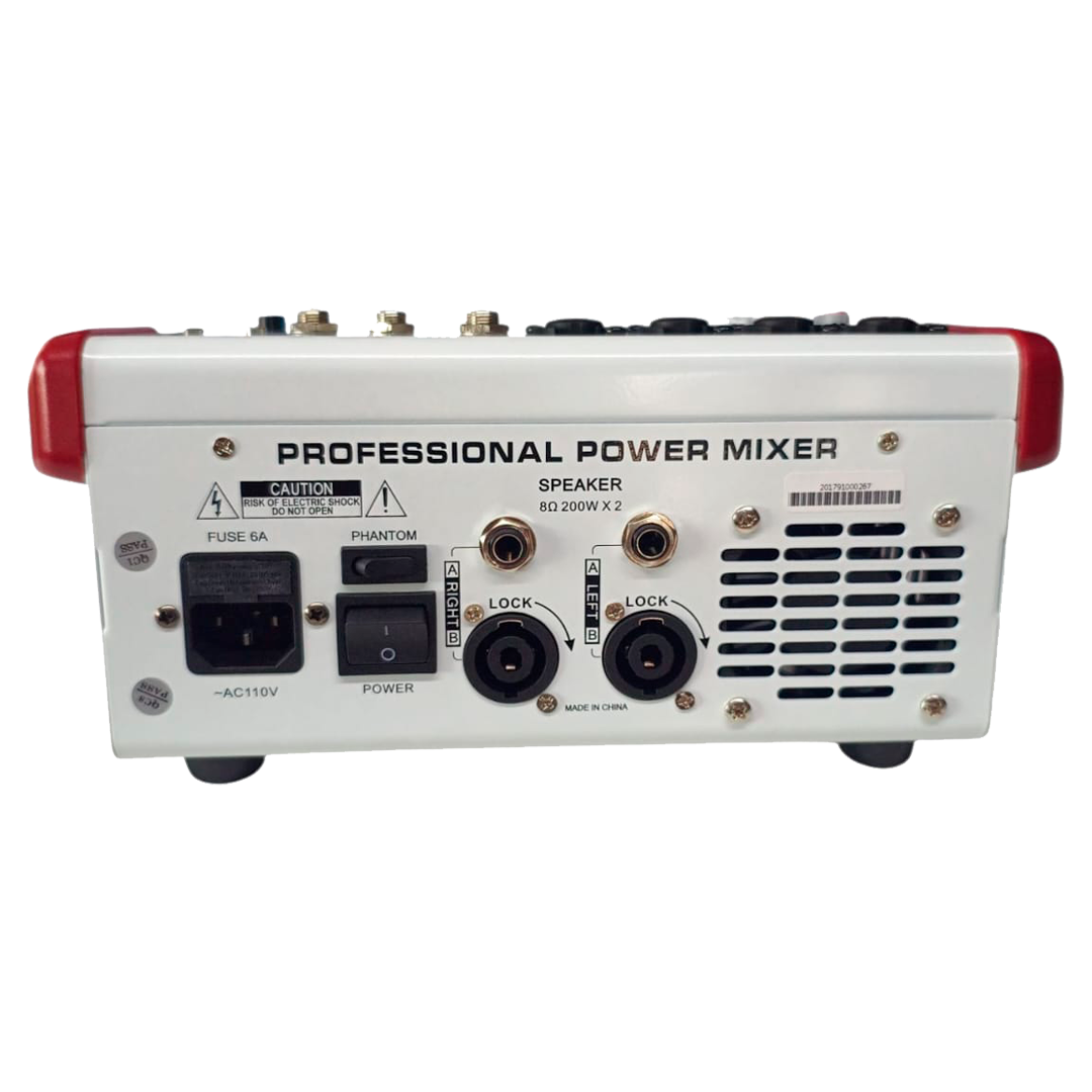 El amplificador de potencia incorporado de 2x200W asegura que la consola pueda proporcionar un sonido potente y claro en cualquier entorno, desde pequeños conciertos hasta eventos de mayor escala. Cada canal está equipado con un ecualizador de 3 bandas, permitiendo ajustes precisos de las frecuencias altas, medias y bajas para una óptima configuración del sonido.