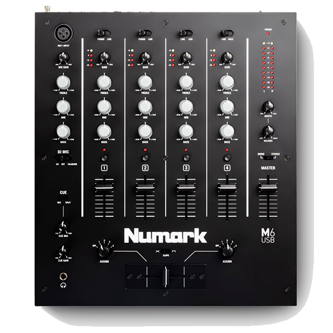 Disfrutará de una gama completa de funciones esenciales para el rendimiento en el M6, incluyendo ecualizador de tres bandas y medición LED por canal. El M6 cuenta con un crossfader reemplazable con control de pendiente, y puede asignar cualquier canal a cualquier lado del crossfader.